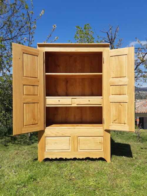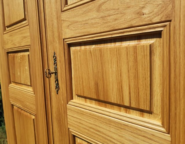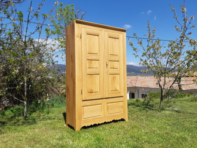 Passage de relais entre une magnifique armoire de salon centenaire, malheureusement trop piquée, et sa fidèle reproduction en chêne massif.