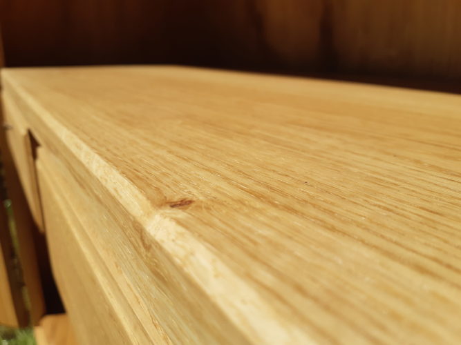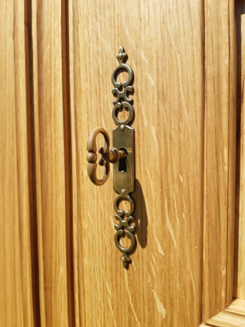 Du laiton pour les fiches à lacets, serrure et boutons de tiroir valorisé sur un beau chêne qui a pris tous son éclat une fois huilée.