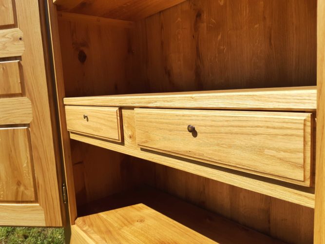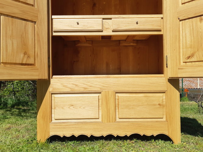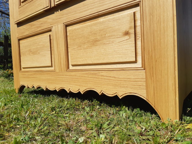 Réplique fidèle des portes si travaillées avec leurs panneautages en mise à mollet et du système de coulissage atypique des tiroirs.