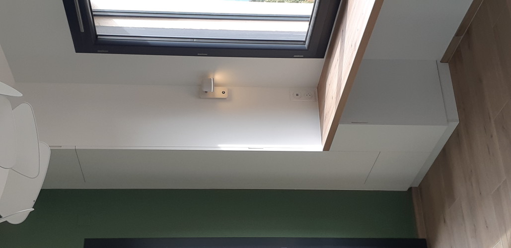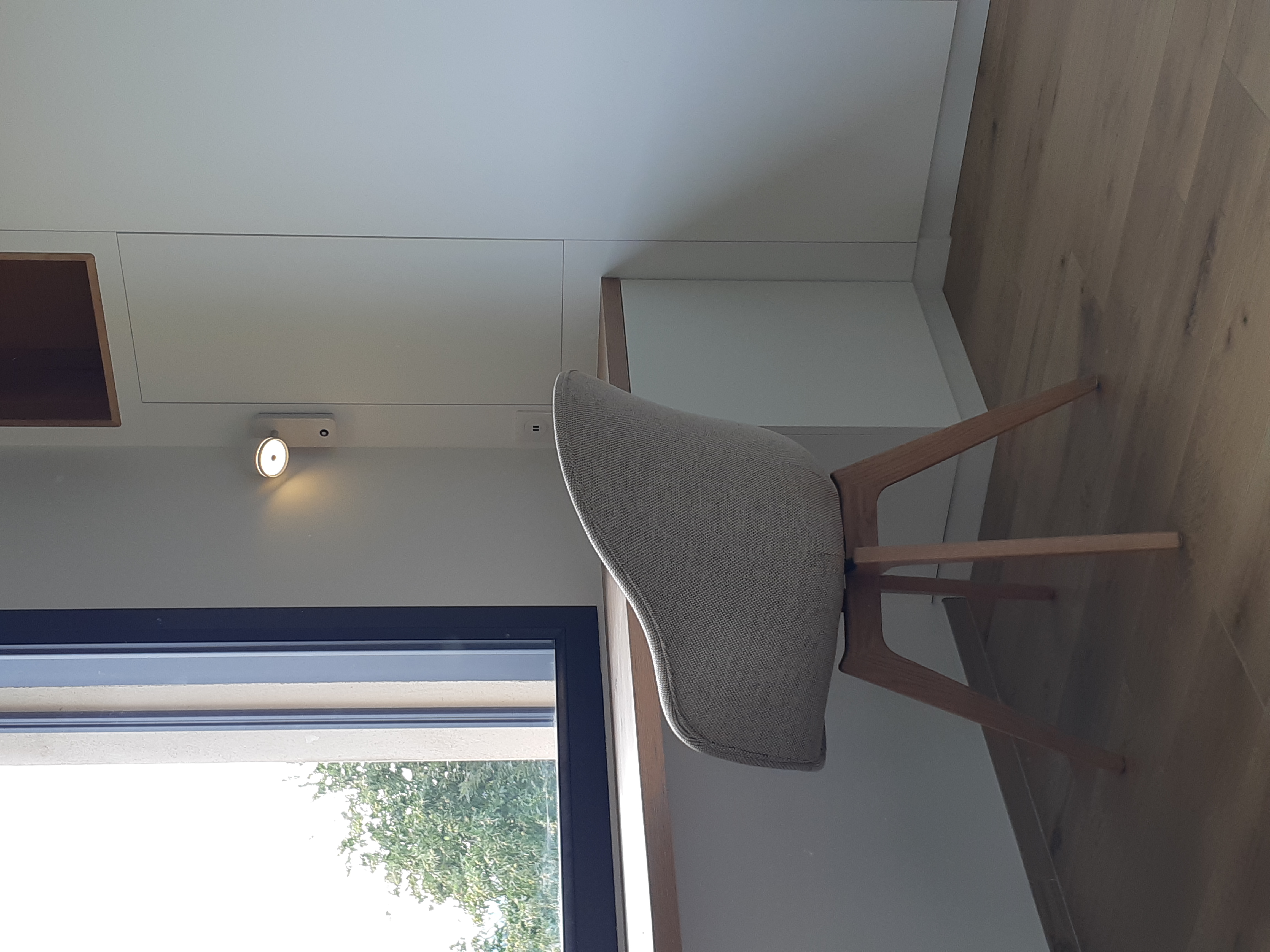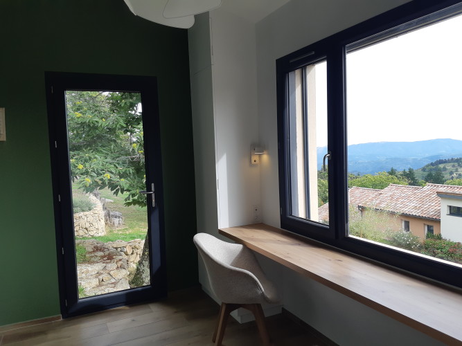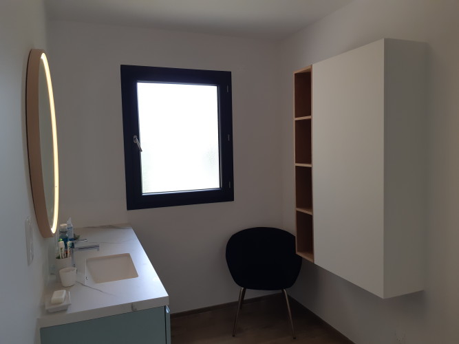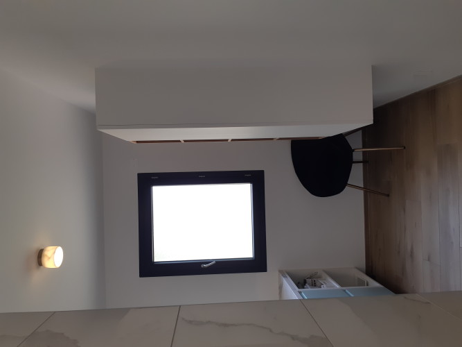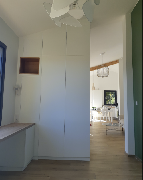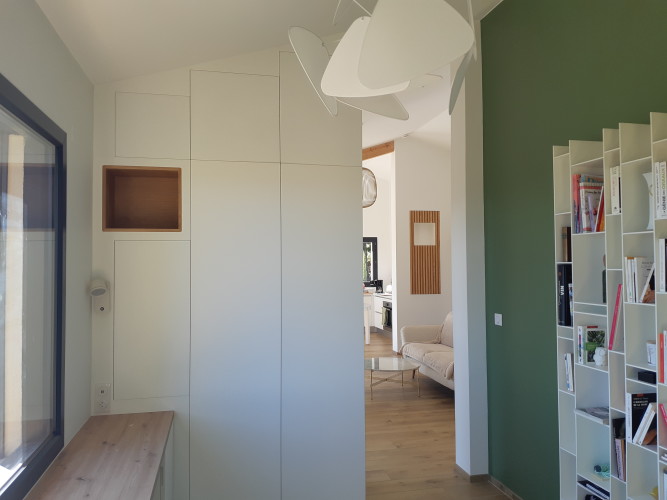 Travaux d’aménagement sur mesure pour une maison nouvellement construite à Gluiras. Une réflexion globale posée sur le salon, le bureau, une partie de la cuisine et la chambre, harmoniser l’ensemble.