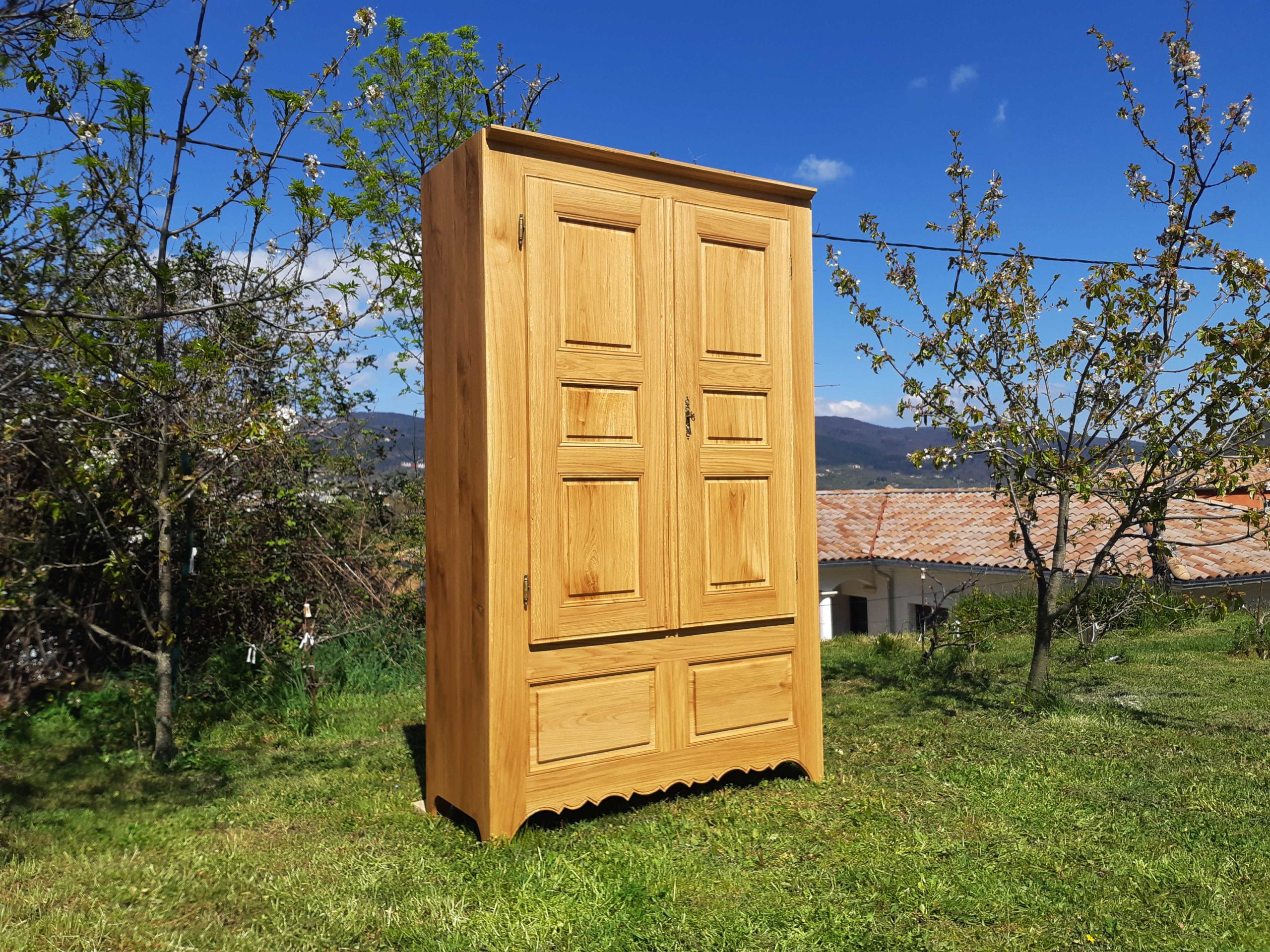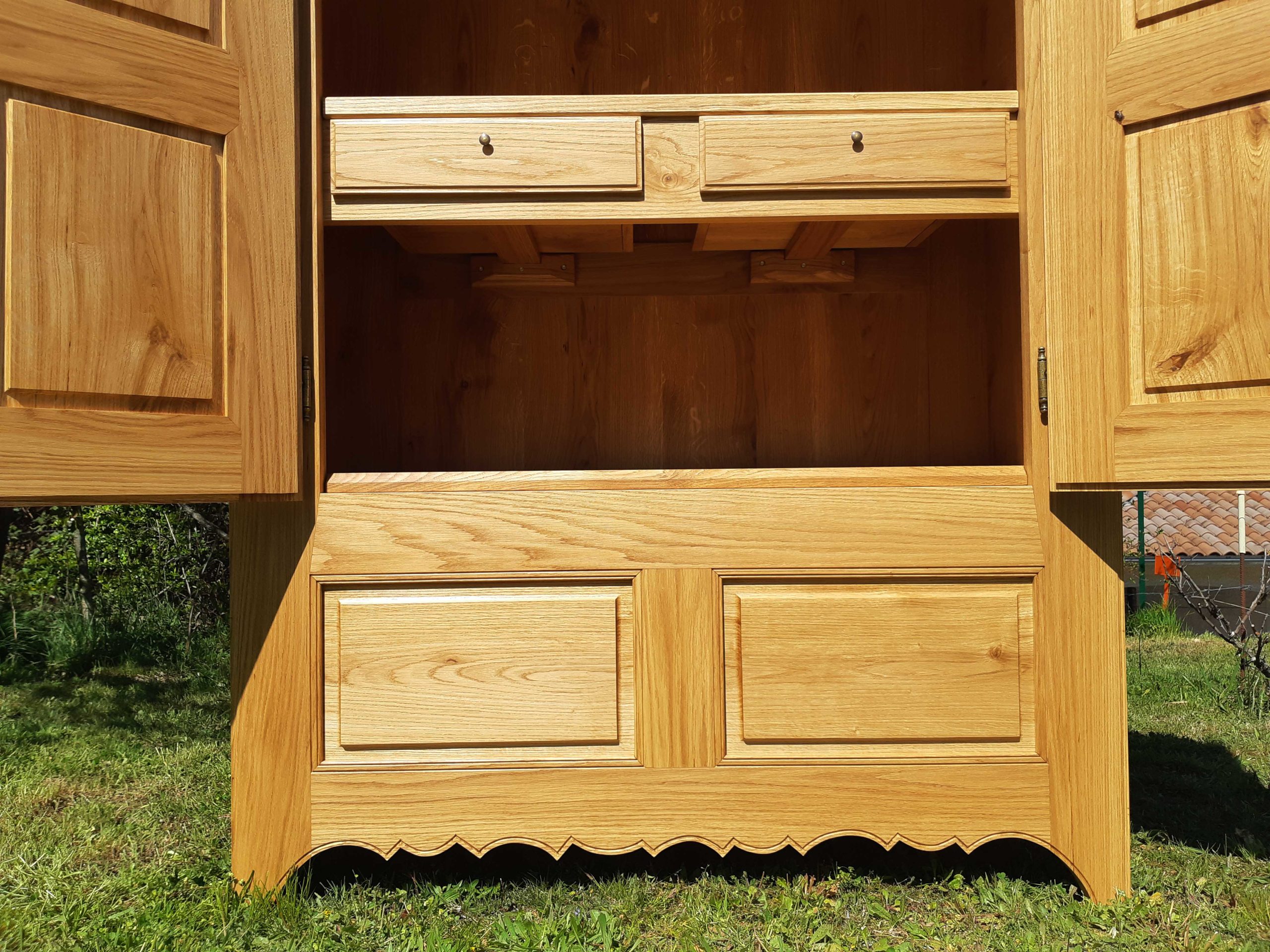Passage de relais entre une magnifique armoire de salon centenaire, malheureusement trop piquée, et sa fidèle reproduction en chêne massif.