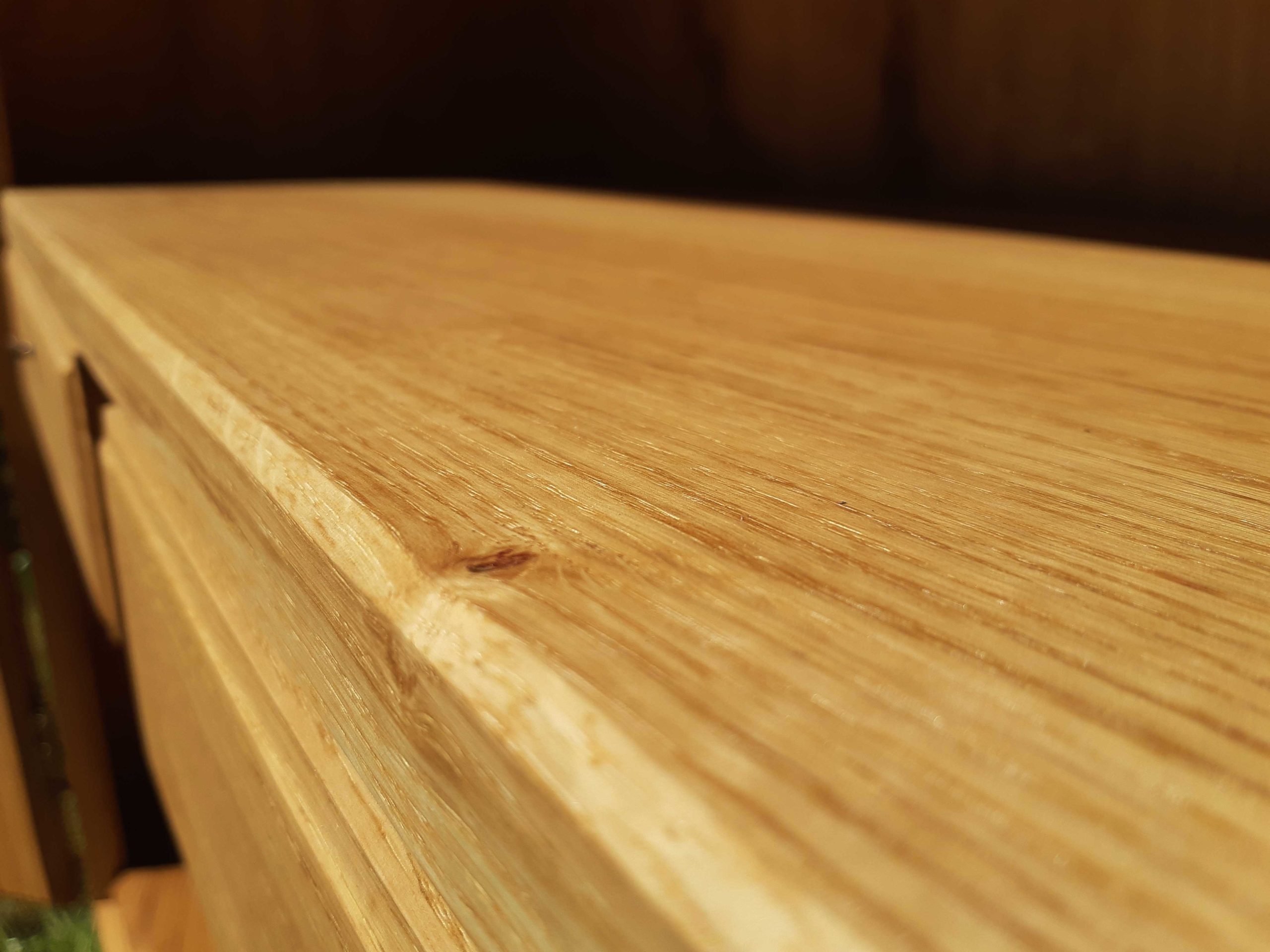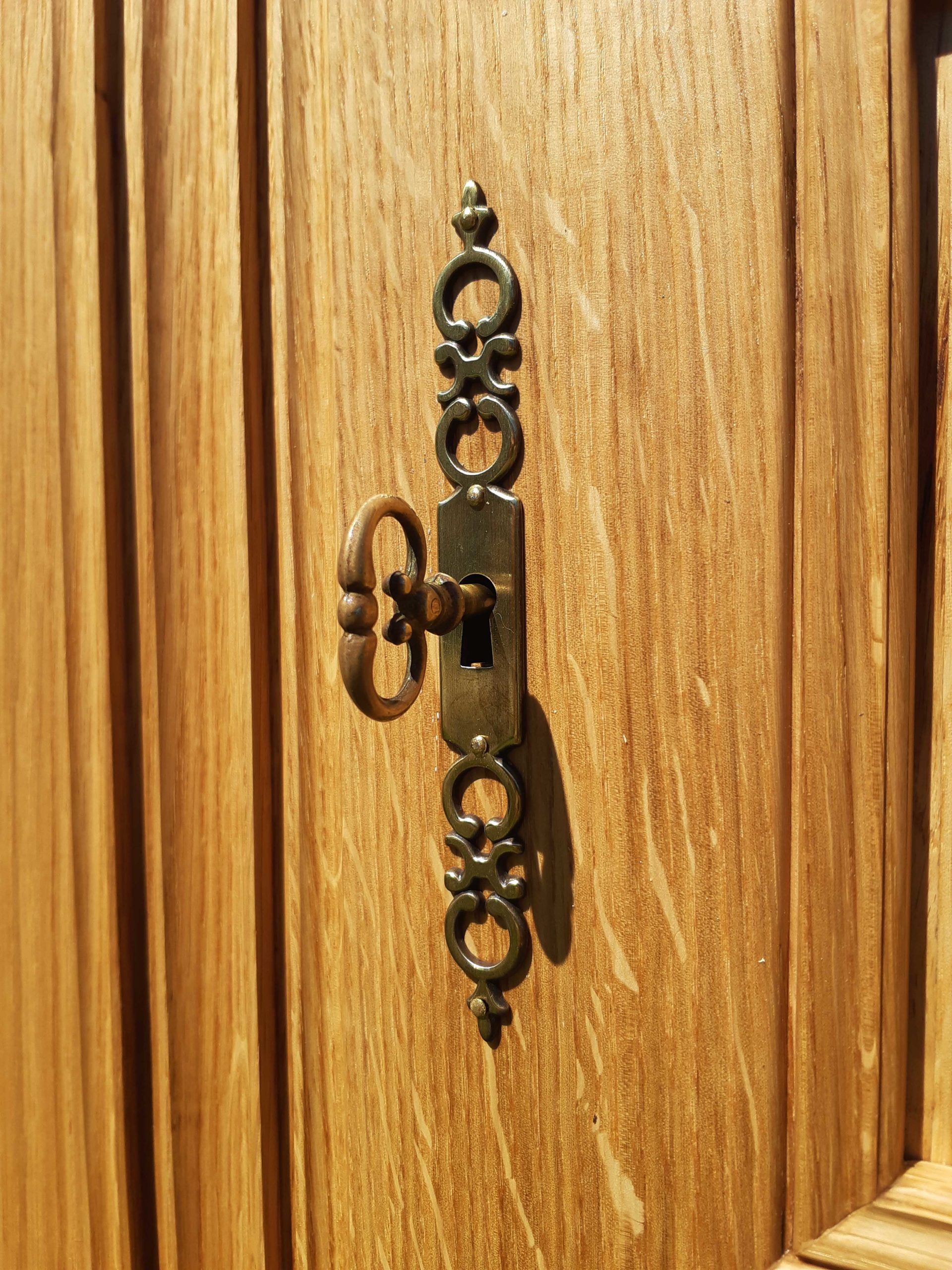 Du laiton pour les fiches à lacets, serrure et boutons de tiroir valorisé sur un beau chêne qui a pris tous son éclat une fois huilée.