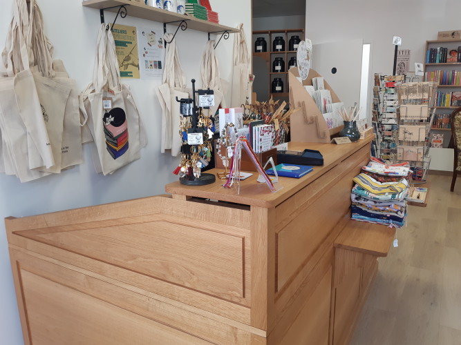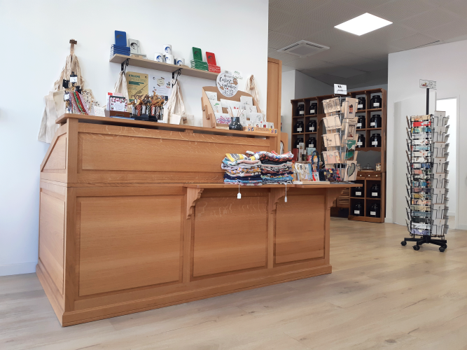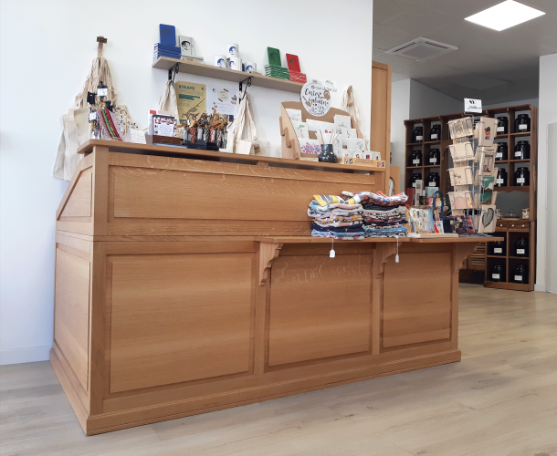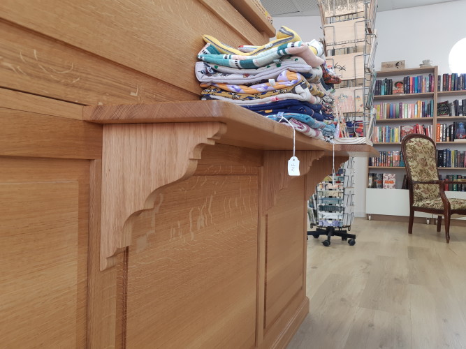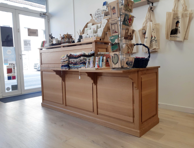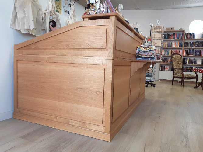 Pour la librairie/salon de thé Aux Bons Mots qui à ouvert au Pouzin, un comptoir en chêne, stable, accueillant, aux lignes douces et dynamiques. Adapté aux personnes à mobilité réduite.