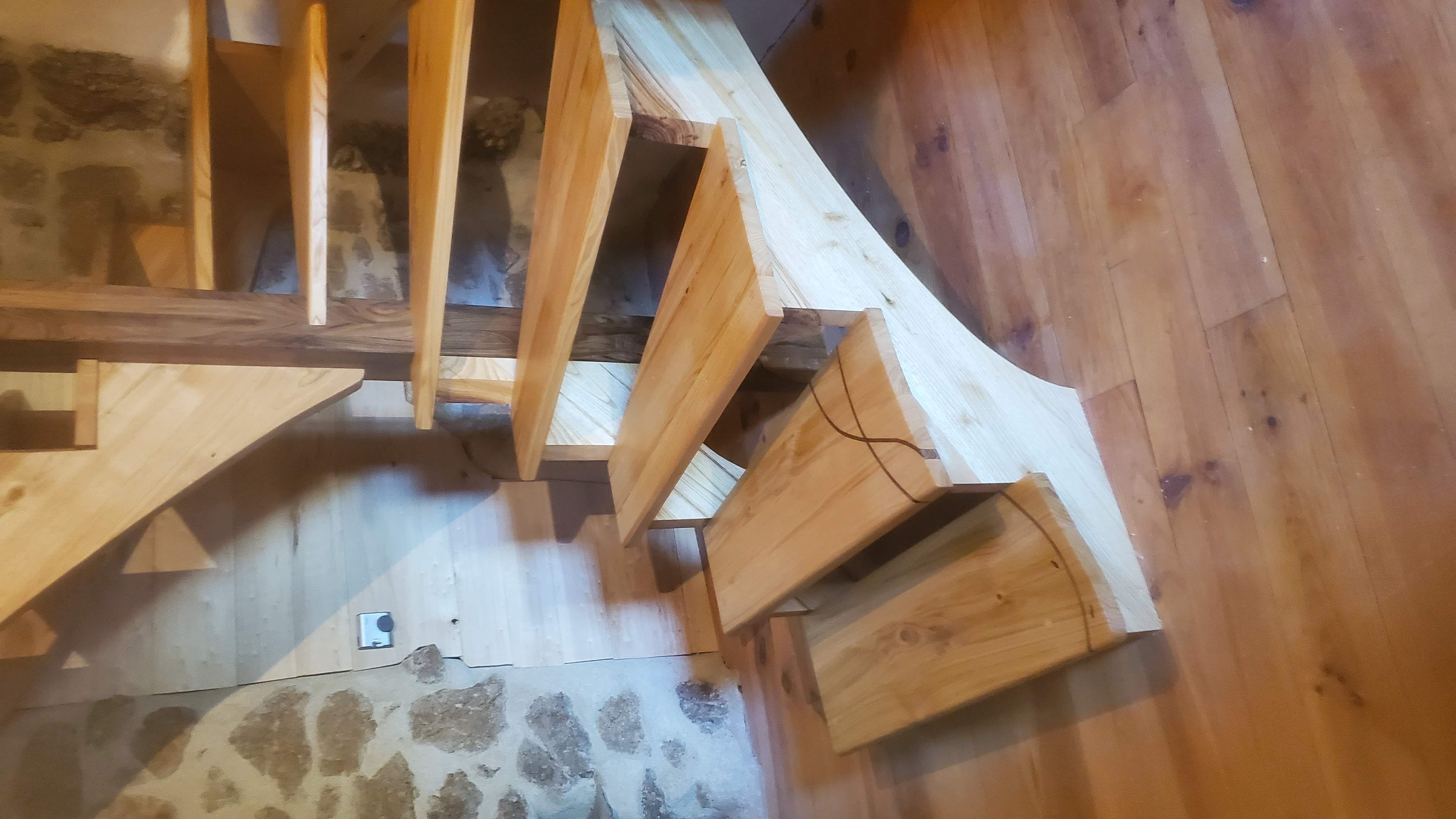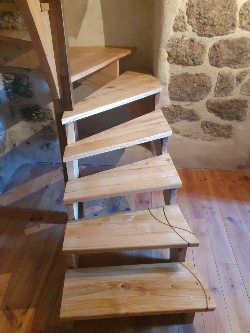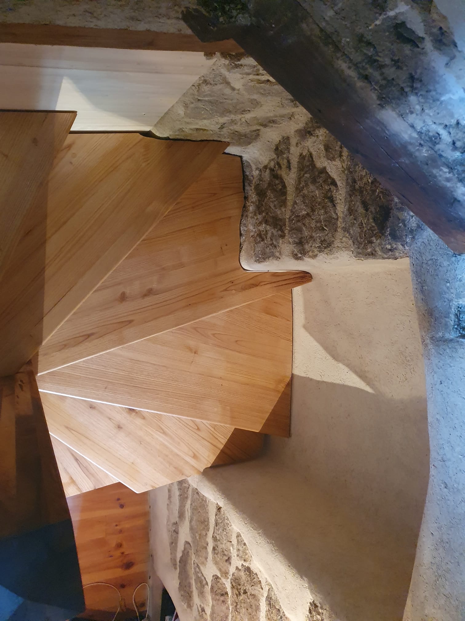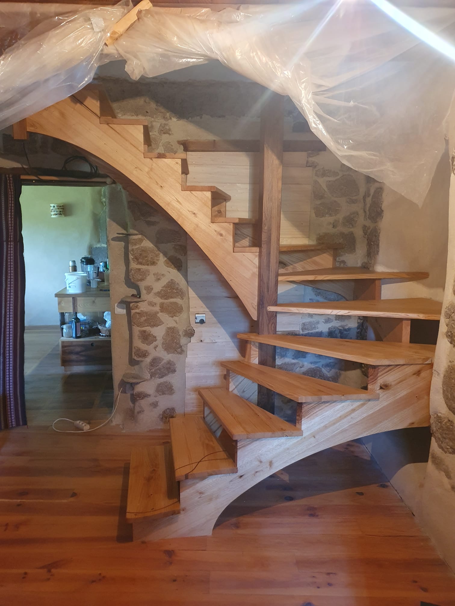 La majorité du bois provient directement des clients, qui l’ont fait sécher de manière naturelle. Marches en châtaignier, poteaux et quelques décos en noyer. Finition huile dure naturelle.