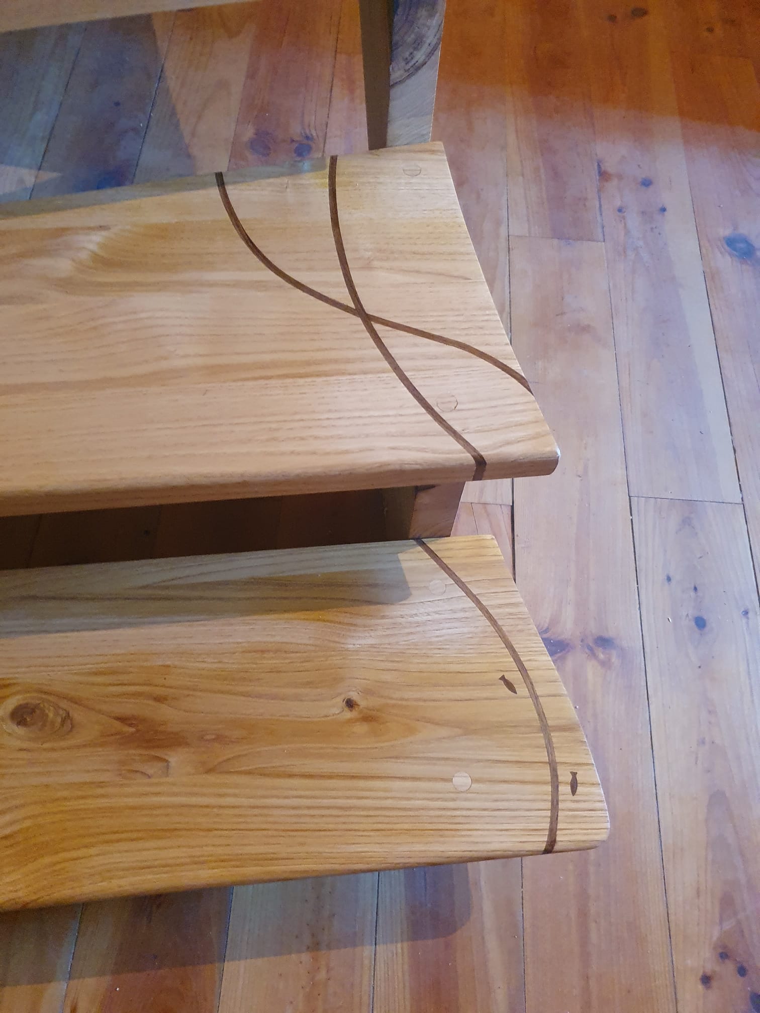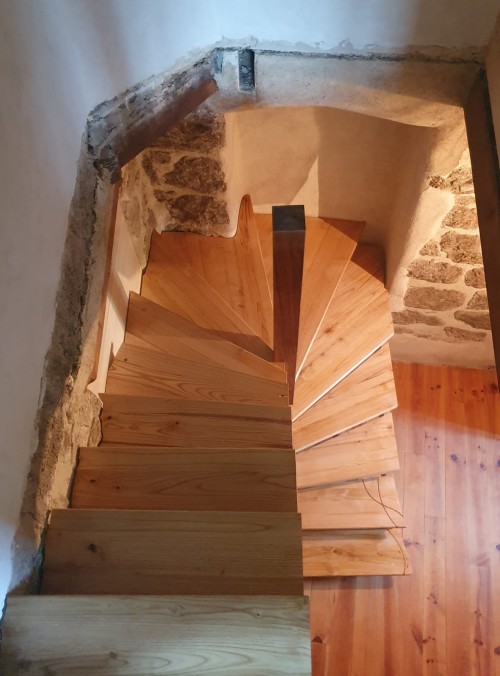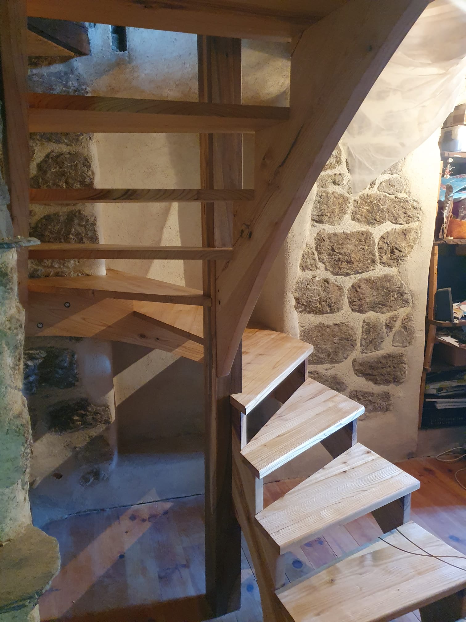 La majorité du bois provient directement des clients, qui l’ont fait sécher de manière naturelle. Marches en châtaignier, poteaux et quelques décos en noyer. Finition huile dure naturelle.