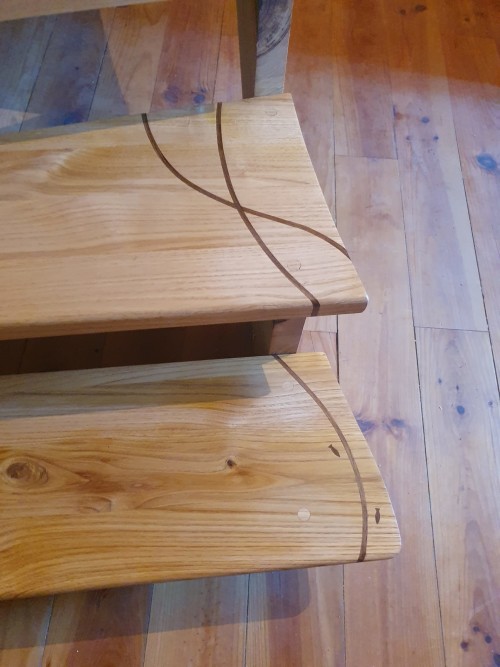 Une sacrée aventure que de faire un escalier : épure en taille réelle au sol, qui permet de réfléchir à ce que la marche soit fluide lors de la montée/descente de l’escalier, découpe et tablettage sur place des marches pour suivre au mieux le mur, s’adapter à la configuration pas très droite (!) de la pièce…et quel plaisir de gravir pour la première fois les marches de l’escalier, et de voir que ça fonctionne 😀 Et une expérience humaine aussi…