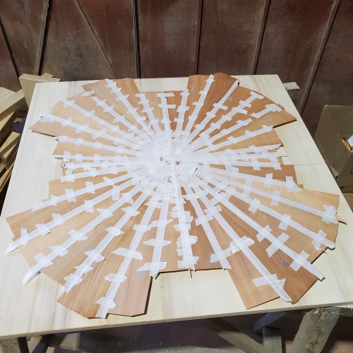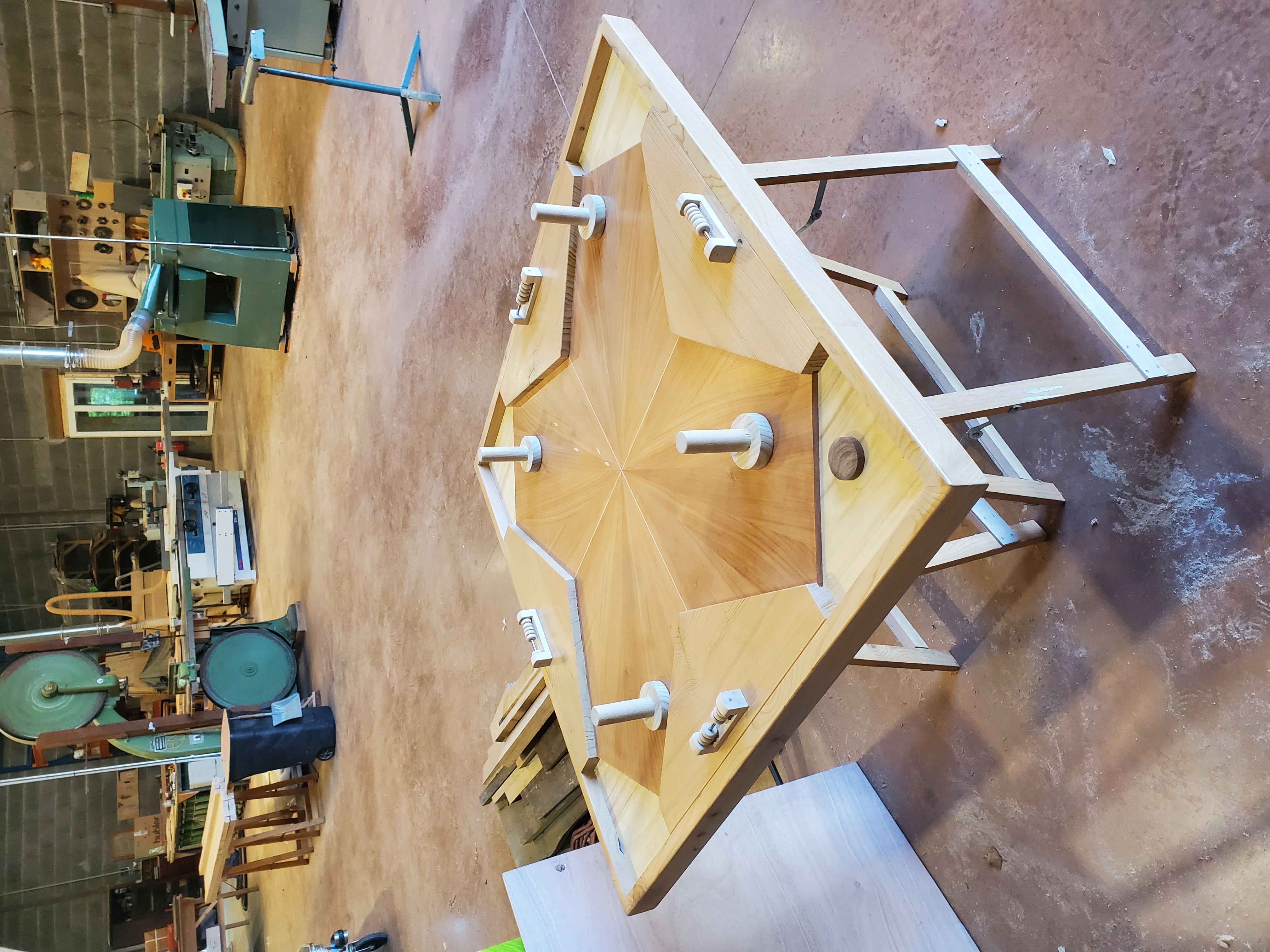 Soleil en merisier, structure visible en cèdre (ça sent boooon), points tournées en érable, palets en noyer. On joue avec les chutes quoi.