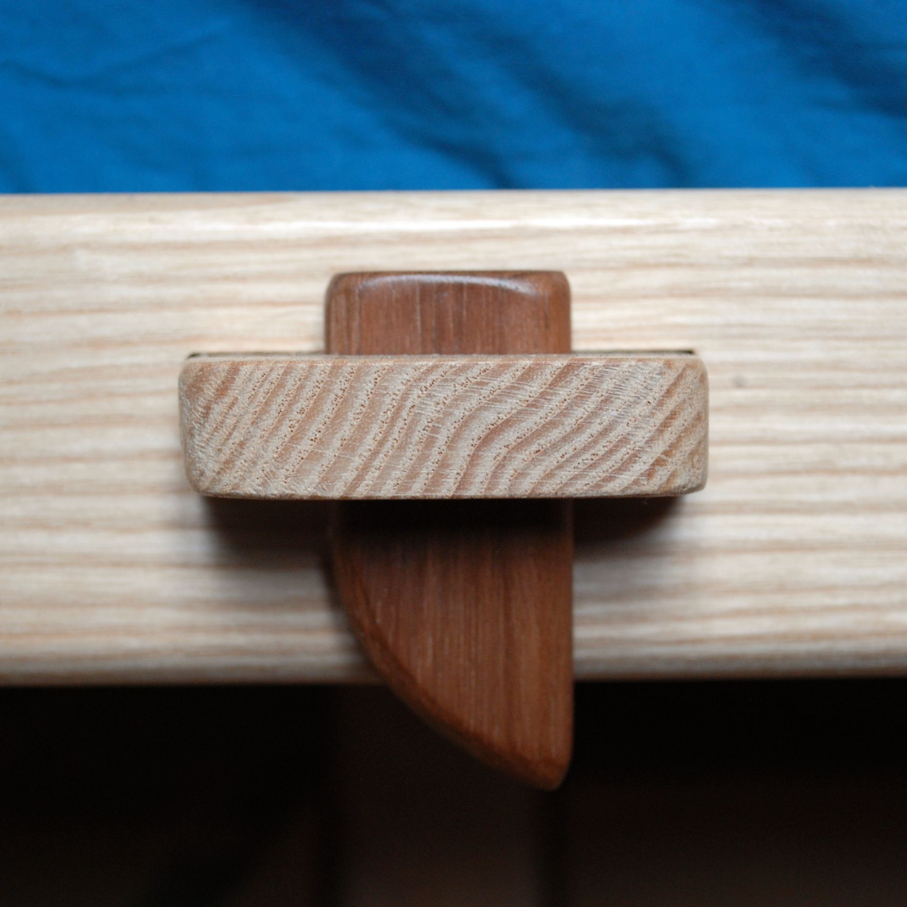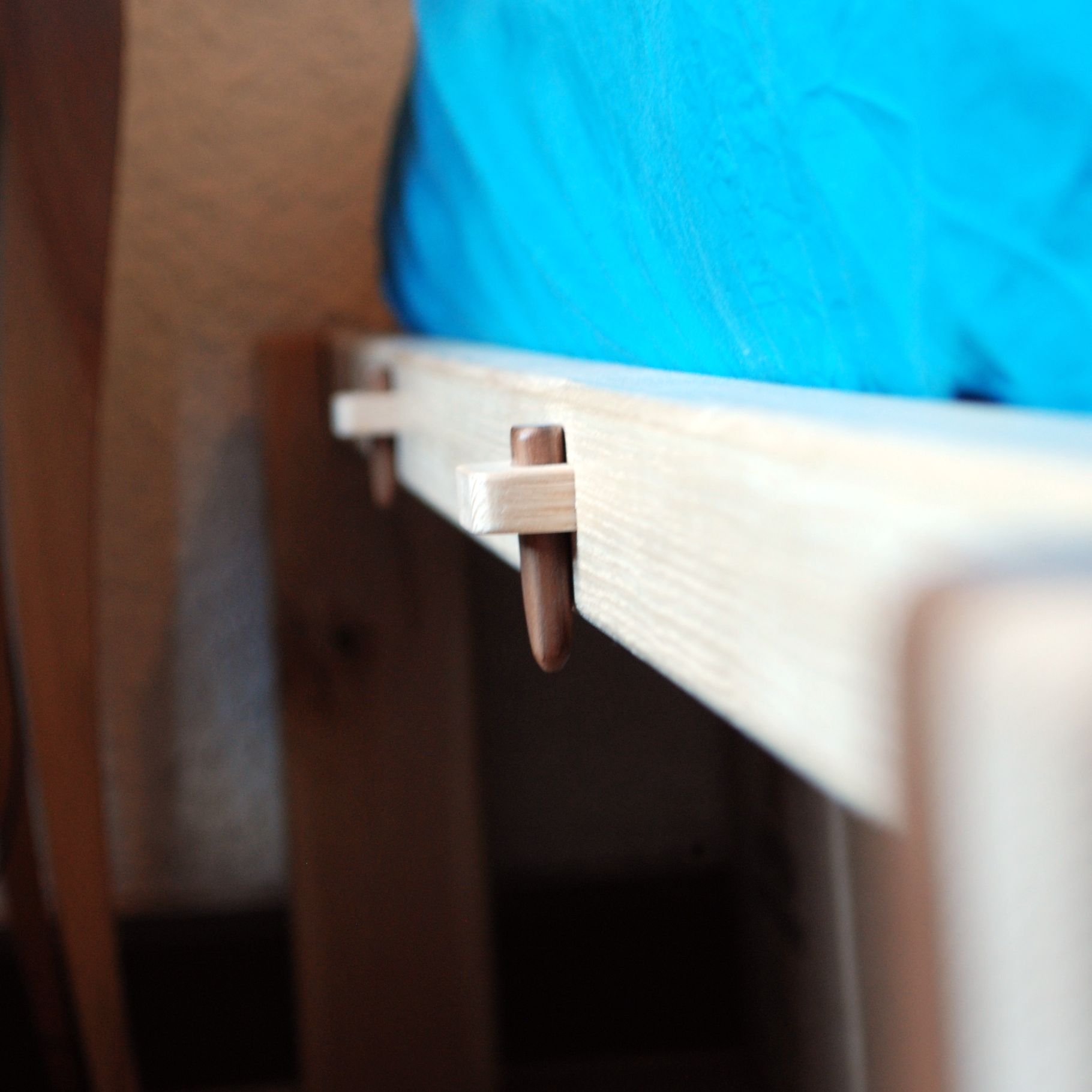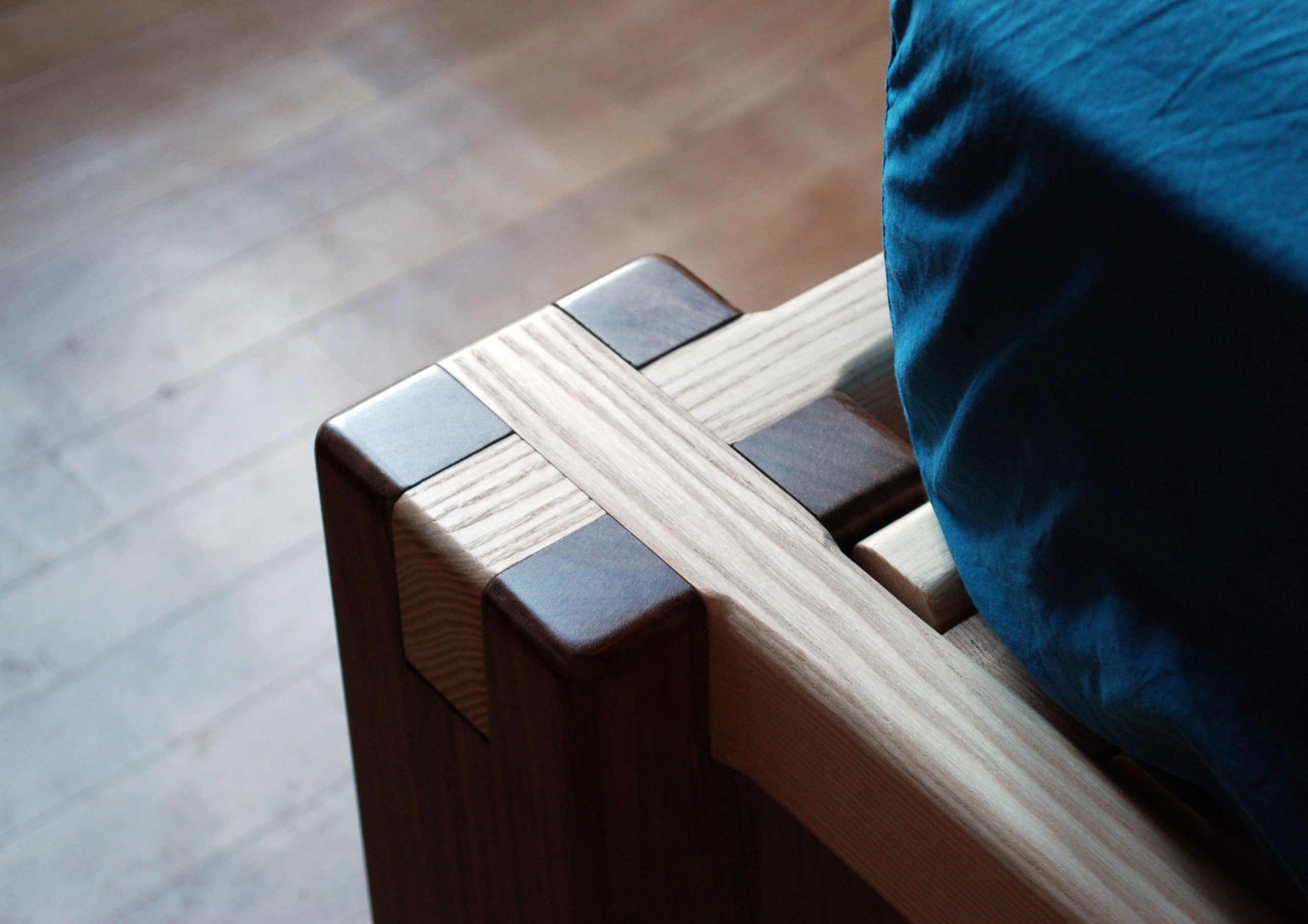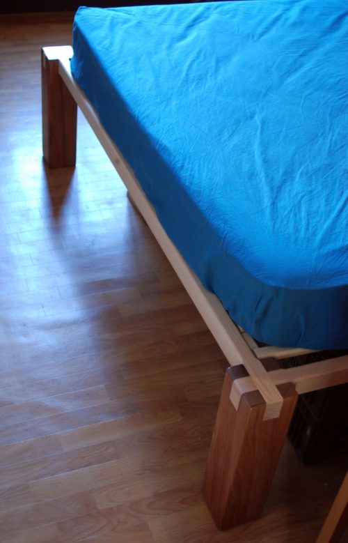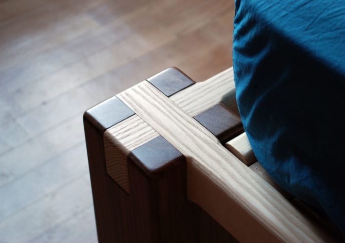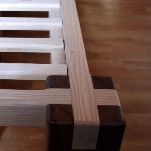 Pieds en noyer et en chêne, cadre en frêne, lattes en pin des landes. Hauteur 45cm. Assemblages traditionnels : mi-bois, enfourchement, tenon-mortaise et clé. Finition à la cire.