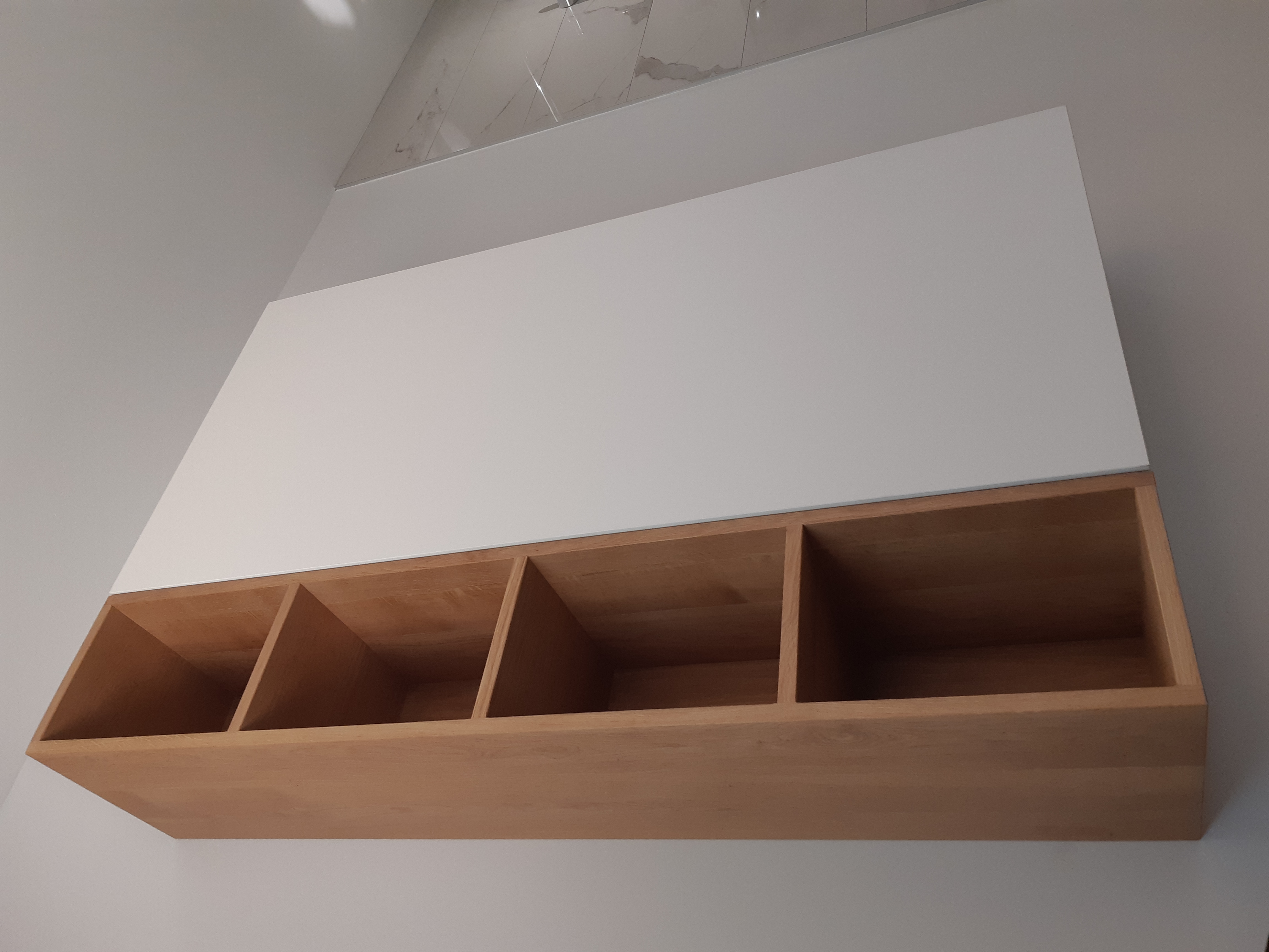 Du médium qui sera peint en blanc de la couleur des murs existants et du chêne par touche dans les niches où les claustras pour réchauffer, faire circuler le regard.