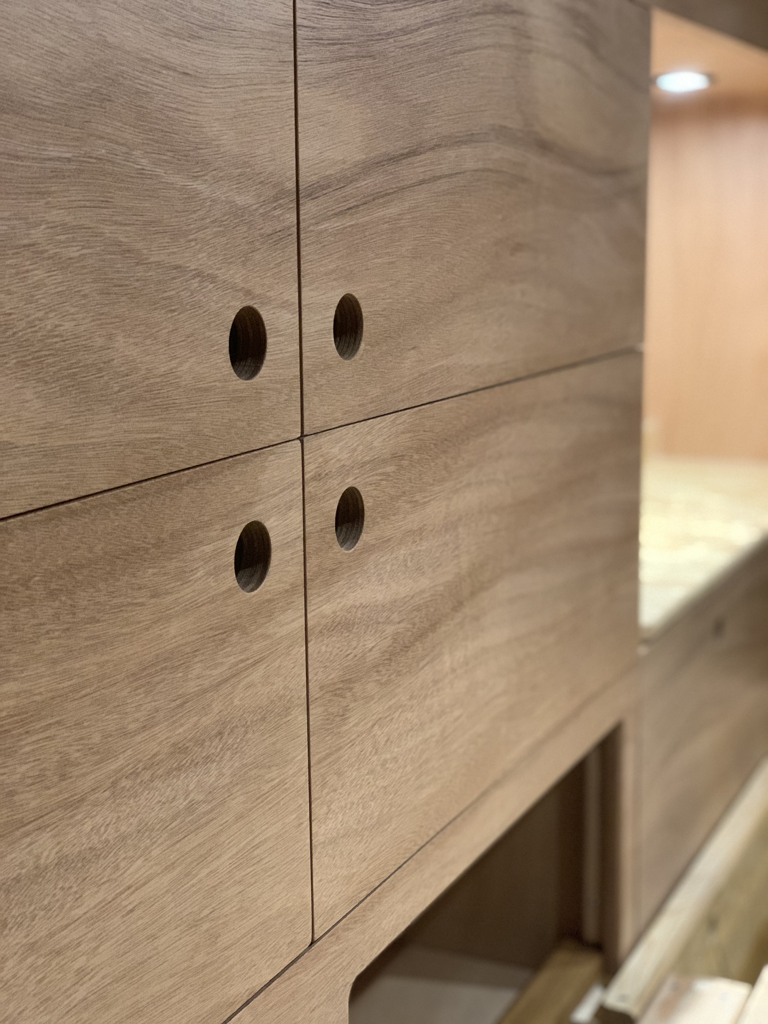 Le jaune claire de l’OSB pour le sol et les premiers rangements. Le rose du contreplaqué qui contamine toutes les hauteurs.